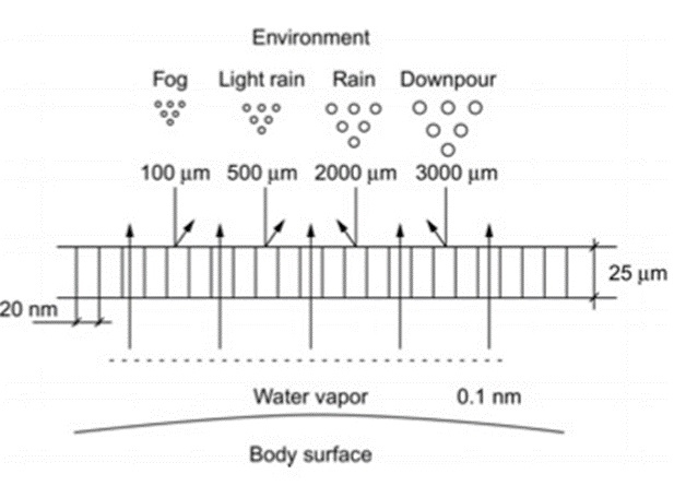 正如上圖所示,最小的雨滴大約為100微米,而水分子的大小介於0.1-10奈米之間。 2-50奈米的孔洞尺寸比最小的雨滴要小得多,從而提供了防水性。但是,這些孔洞大於水分子,可以允許來自人體的水蒸汽穿過微孔狀PU層。